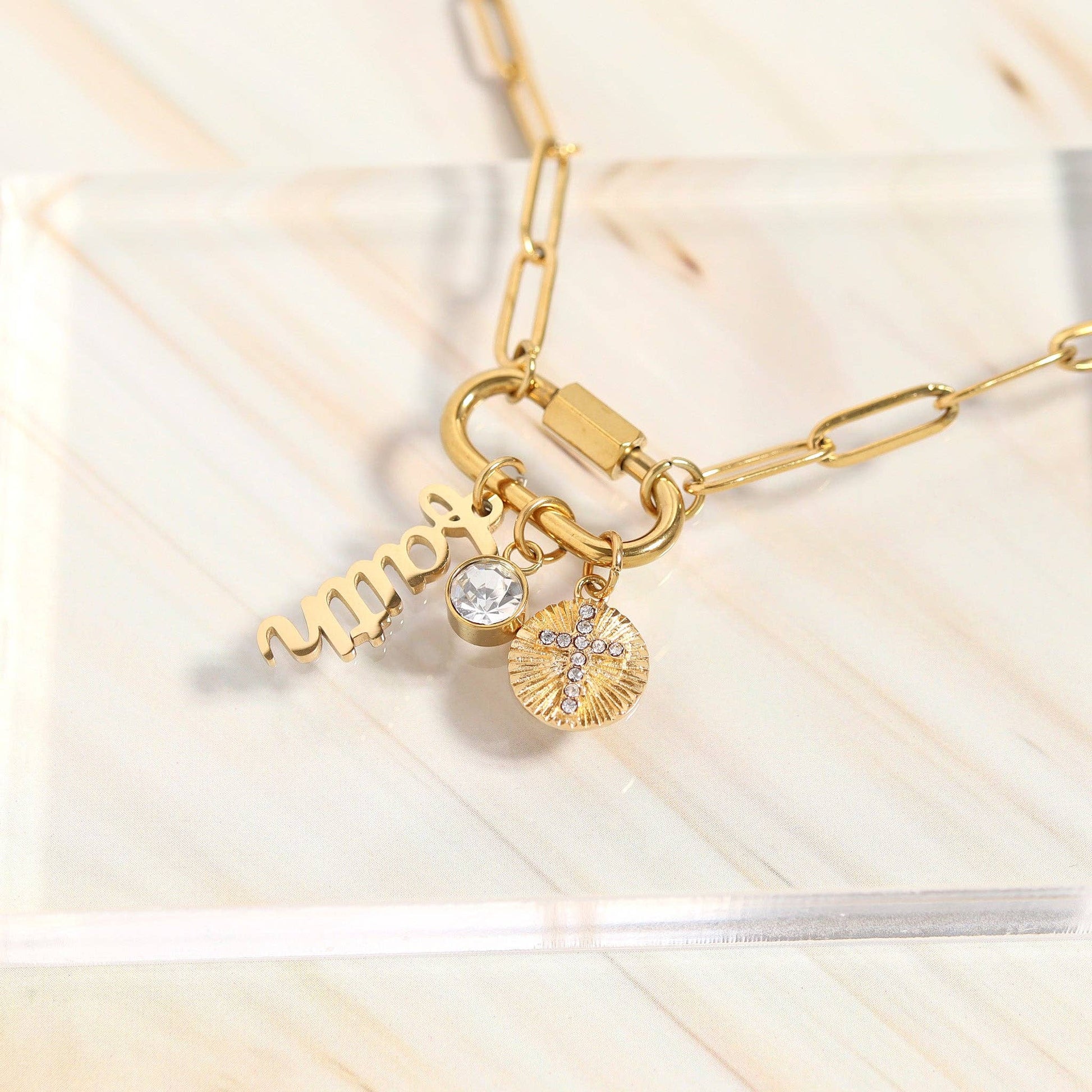 18K PVD Gold Carabiner "Faith" Paperclip Charm Necklace