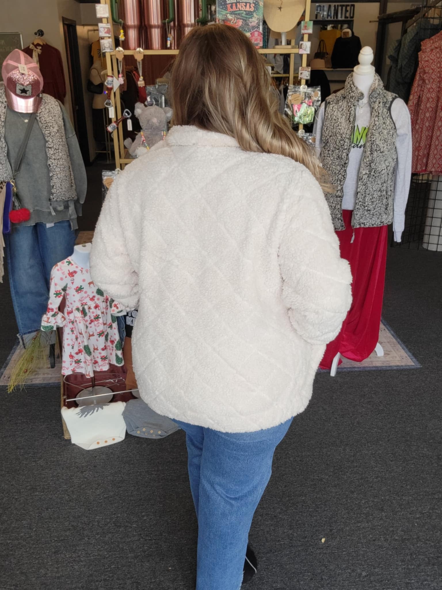 The Candie Diamond Sherpa Jacket features a quilted design and a soft, warm sherpa lining with suede trim. It includes two open front pockets and two side pockets, and is made of 100% polyester fabric.