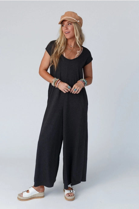 Meet your new go-to: the Daphne Scoop Neck Jumpsuit! Crafted from soft, stretchy knit fabric, it offers a relaxed fit with flowy wide legs that move with you. The flattering scoop neckline is perfect for showing off your favorite bralette, while classic short sleeves and handy side pockets add effortless style and function. Whether you're lounging or out and about, this jumpsuit combines comfort and chic in one playful package.