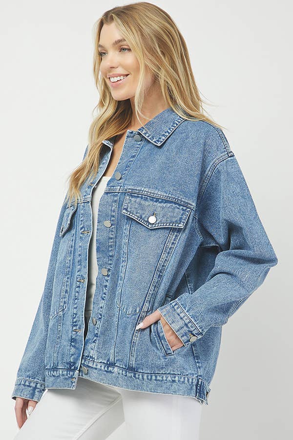 Meet your new go-to layering piece! This oversized denim jacket blends classic charm with modern ease, making it a must-have for any wardrobe. Crafted from high-quality, medium-wash denim, this jacket boasts a slightly faded look that adds a vintage-inspired touch.