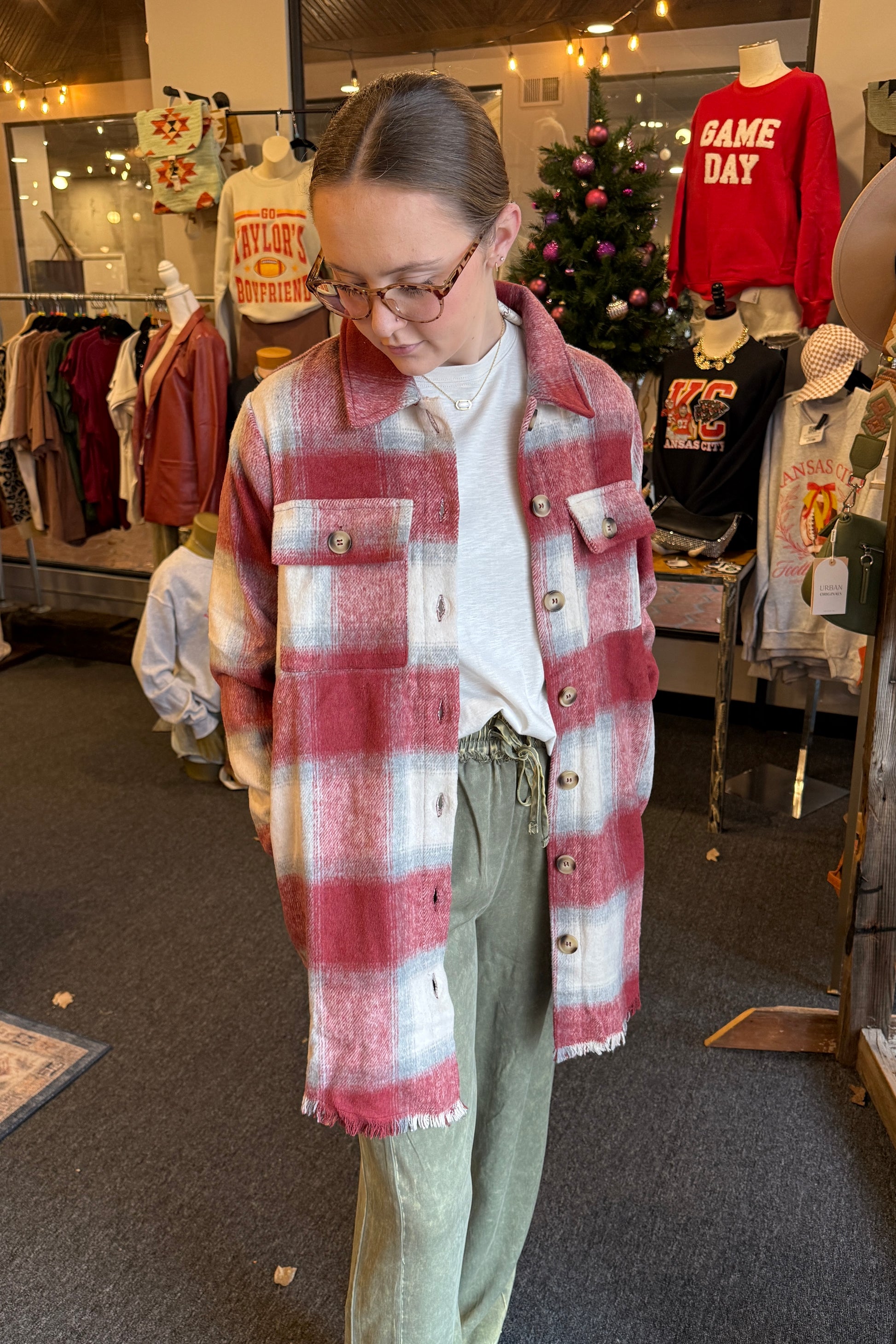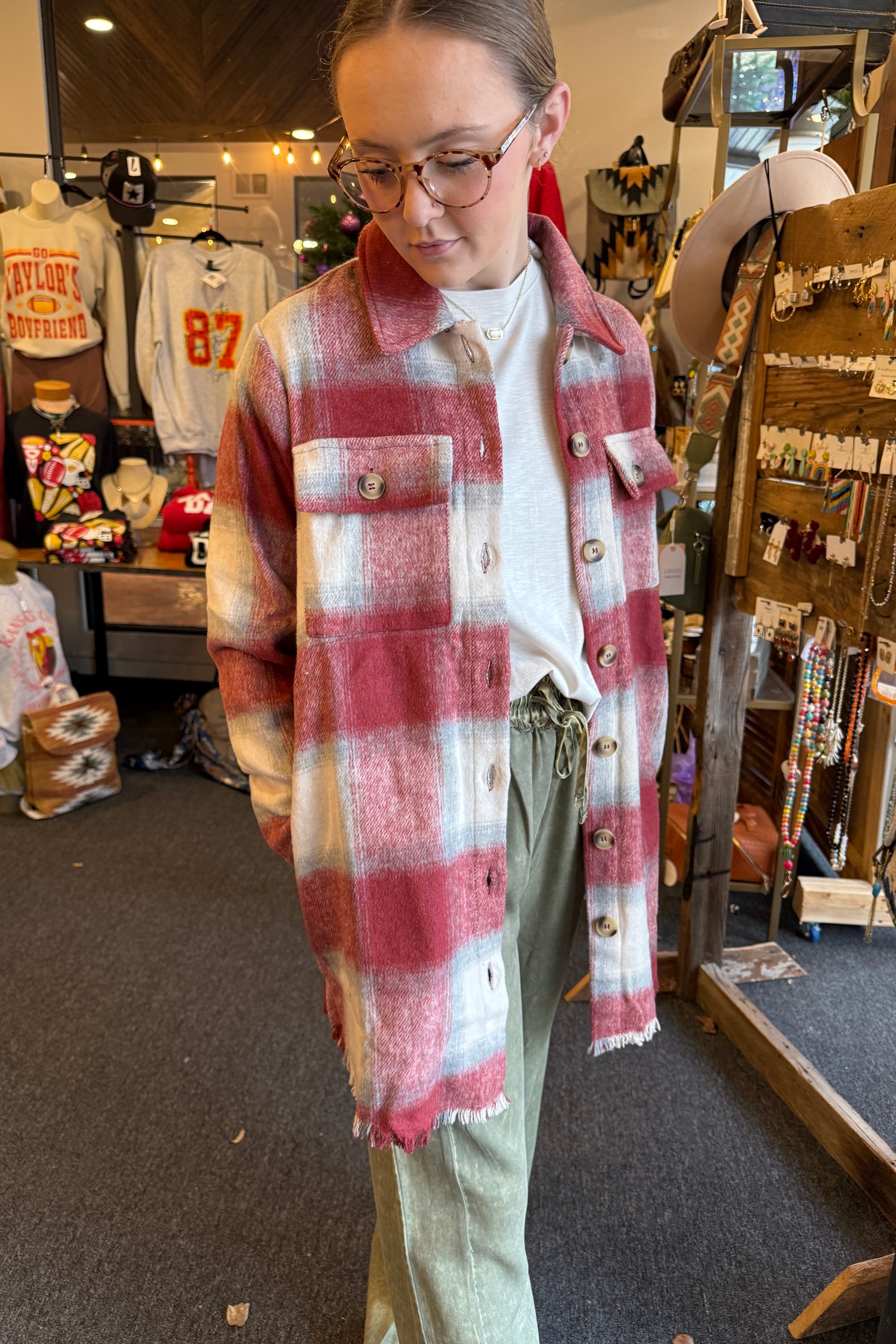 Fringe Detail Long Plaid Jacket Button down Buttoned chest pockets Side pockets Thigh length Hi-lo hem Fringe hem and cuffs