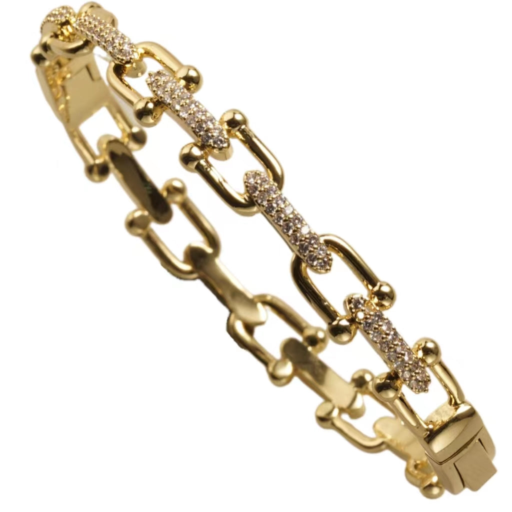 Bring a little luck and sparkle to your wrist with the Horseshoe Link CZ Bracelet. Featuring dazzling cubic zirconia and a secure yet easy-to-use clasp, this playful bracelet adds charm and confidence to any outfit. Perfect for everyday wear or special moments! Available in both Gold & Silver