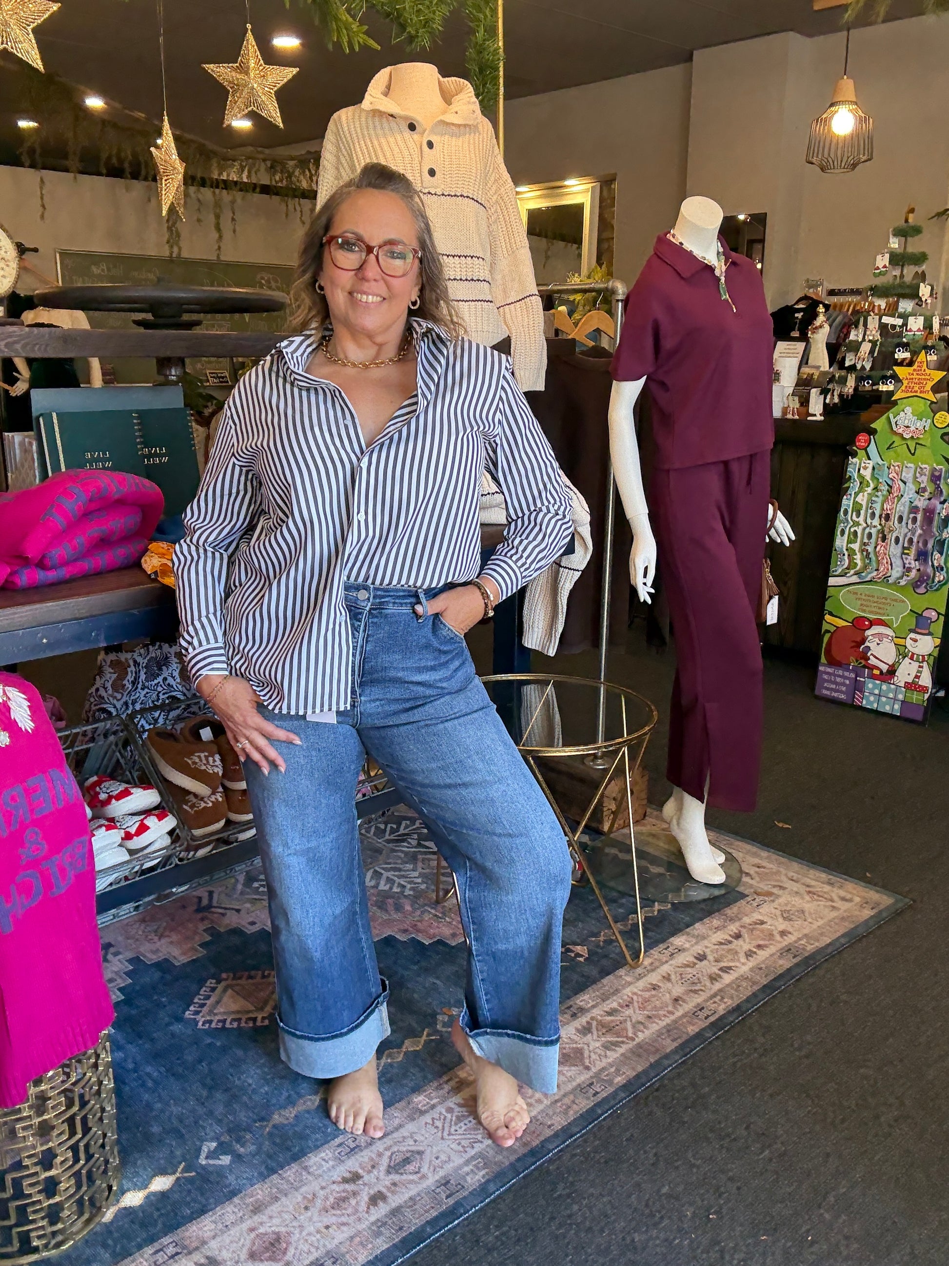 Timeless stripes meet modern ease in this wardrobe staple. Imagine it unbuttoned at the collar, sleeves casually rolled—pure relaxed sophistication. Made from a durable cotton-polyester blend (85/15), it laughs in the face of wrinkles and keeps its shape through countless wears. Oversized and versatile, this striped shirt transitions seamlessly from casual weekends to polished weekdays. Your go-to for looking intentionally effortless.
